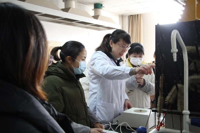 在实验教学培训会上,梁爱琴就如何规范实验操作、避免潜在安全隐患、提高实验课教学效果和学生学习积极性创造性等问题进行了实验教学经验分享。她表示,教师在实验教学中建议实行小组制管理,并且对实验操作能力强、勤学好问的学生进行表扬,对错误操作的学生进行耐心指导,此外建议教师在教学的过程中要注意教学方式方法的创新。随后,梁爱琴、杨曼丽分别讲解了各个实验所需要注意的问题,并进行了实验操作标准化现场演示。参会的教师认真学习,积极练习实验操作。