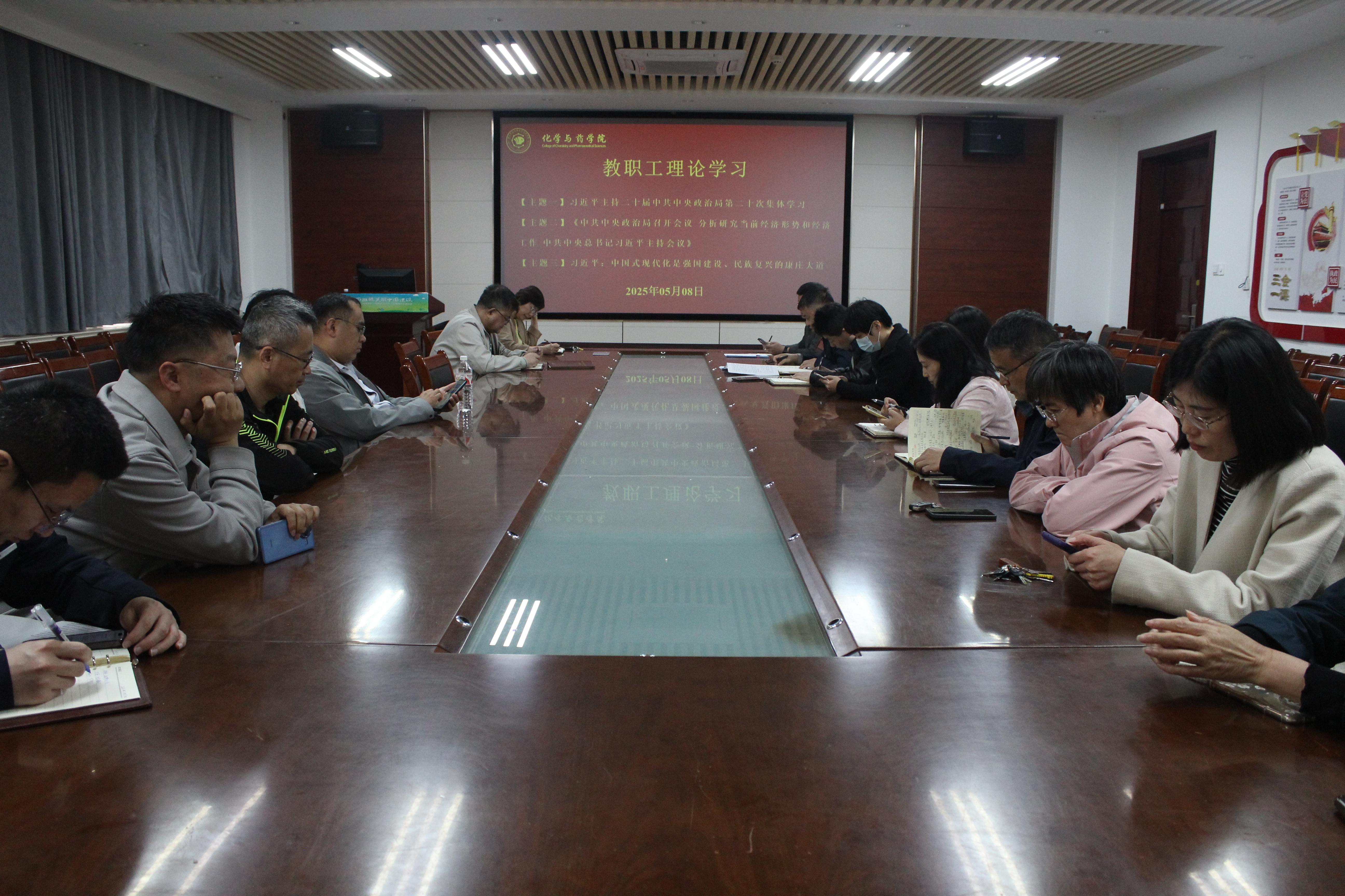 5月8日,学院于化学楼207开展教职工理论学习,学院党委书记王进国主持,全体教职工参加。