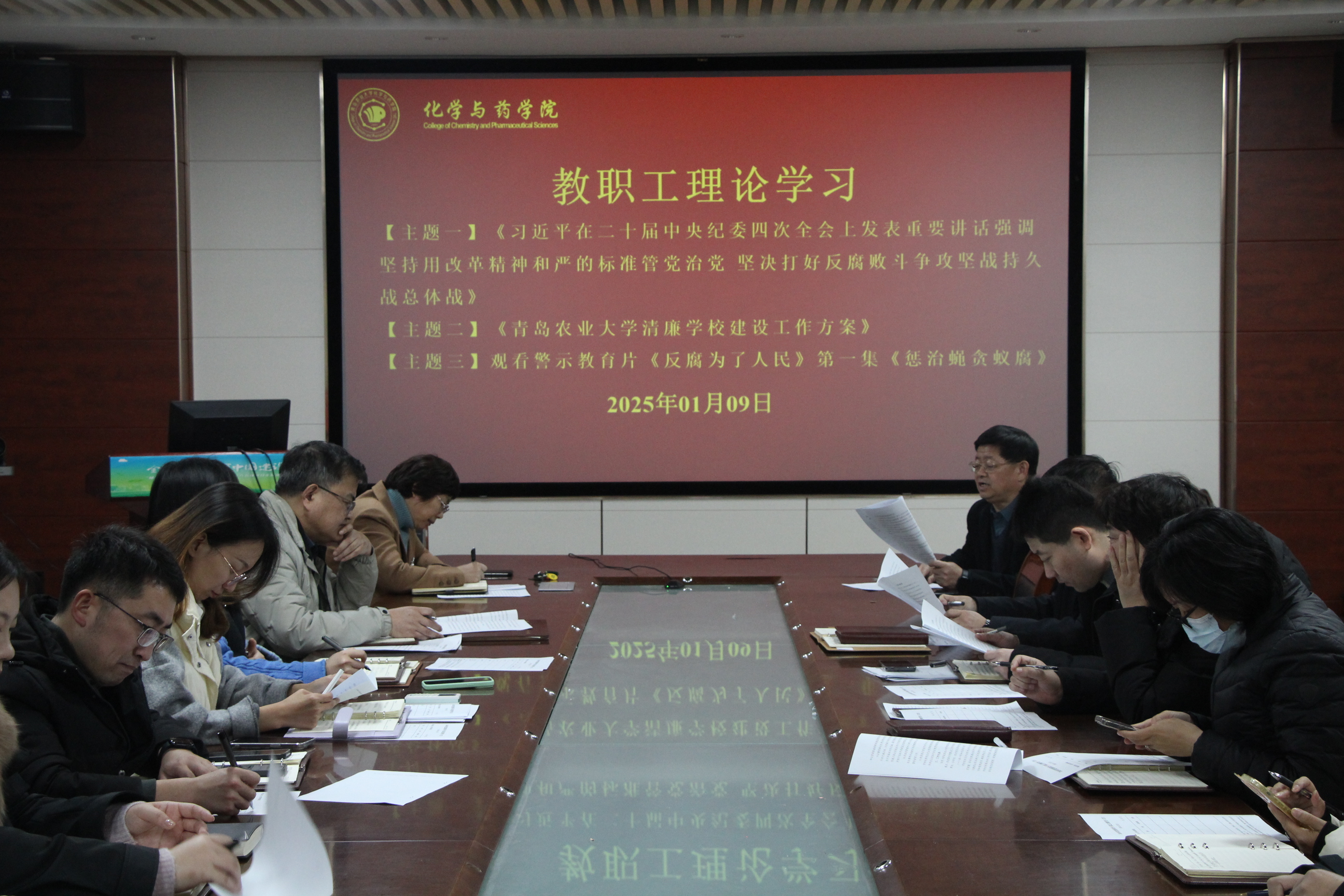 1月9日,青岛农业大学45分钟过瘾拔萝卜视频于化学楼207会议室开展教职工理论学习,会议由学院党委书记王进国主持,全体教职工参加 ,集体学习习近平总书记在二十届中央纪委四次全会上的重要讲话精神。