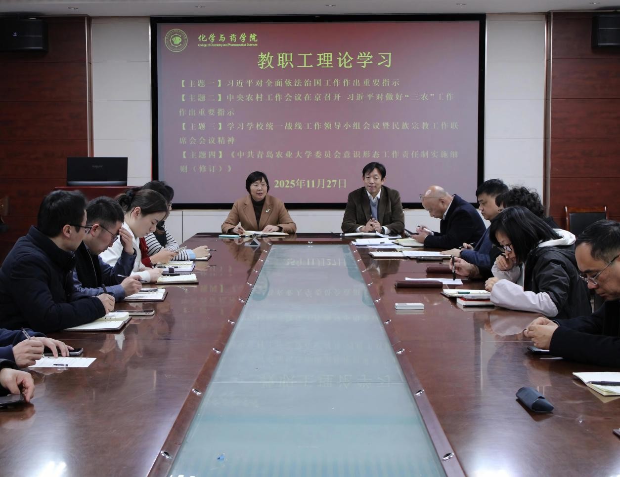 会议强调,全体教职工一要深入学习贯彻习近平法治思想,将法治理念贯穿教育教学全过程,引导学生树立法治观念,提升依法治教与规范管理水平;二要紧密围绕“三农”工作核心任务,充分发挥学科专业优势,加强科研创新与社会服务,为全面推进乡村振兴提供智力支撑;三要认真落实学校关于民族宗教工作的部署要求,持续铸牢中华民族共同体意识,严格落实意识形态工作责任制,筑牢校园意识形态安全防线。