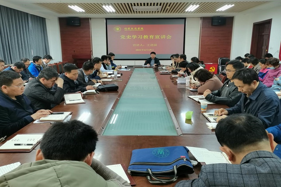 最后,王进国强调,征途漫漫,惟有奋斗。全体党员干部和学院师生要通过党史学习教育,不忘初心、牢记使命,做到学有所思、学有所悟、学有所得,用中国共产党艰苦卓越的奋斗历程和革命先辈的英雄事迹激励我们,为学校、学院的发展建设做贡献智慧和力量,以昂扬姿态奋力开启建设社会主义现代化国家新征程,以优异成绩迎接建党100周年和建校70周年。