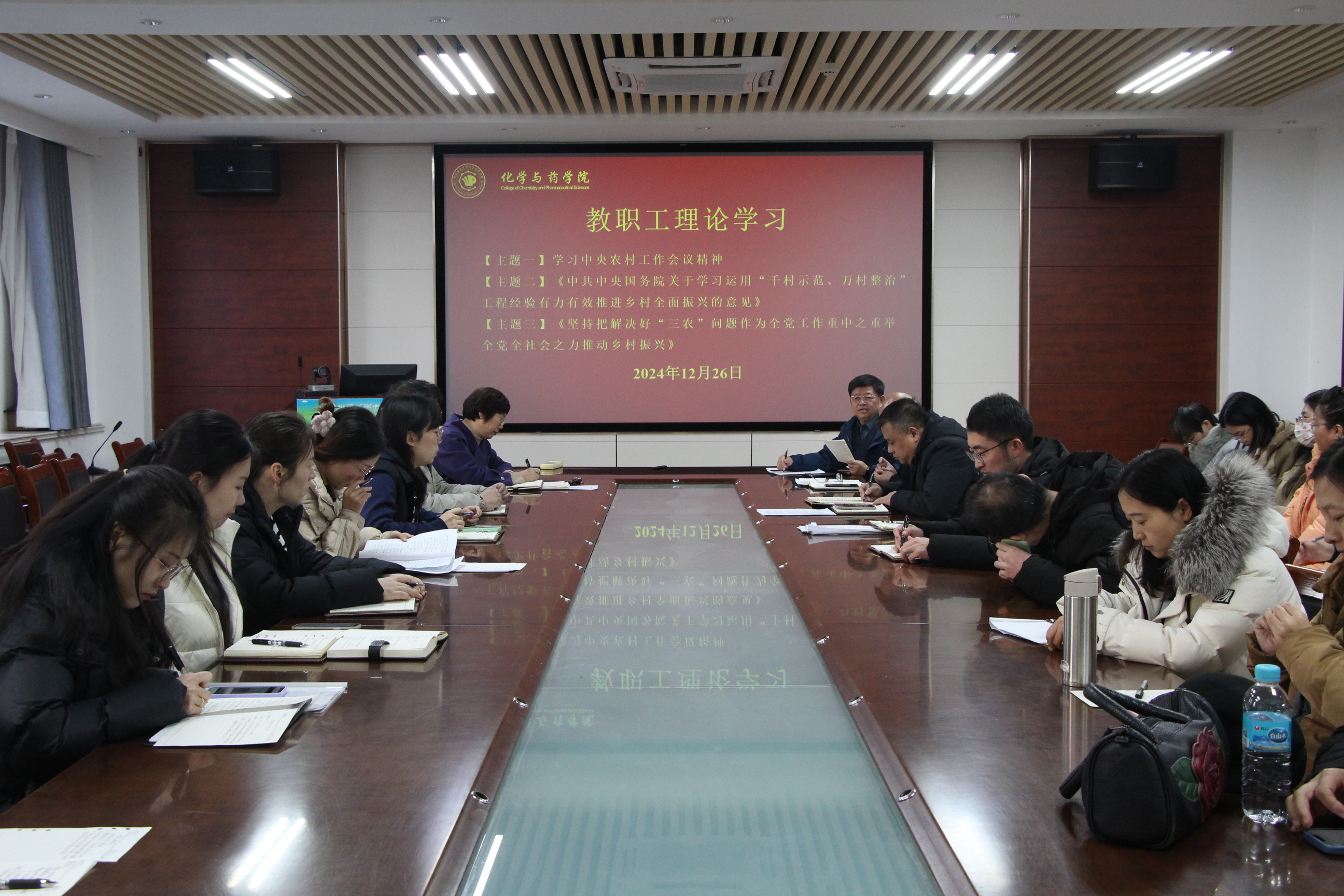 12月26日,学院于化学楼207会议室开展教职工理论学习,学院党委书记王进国主持,全体教职工参加。