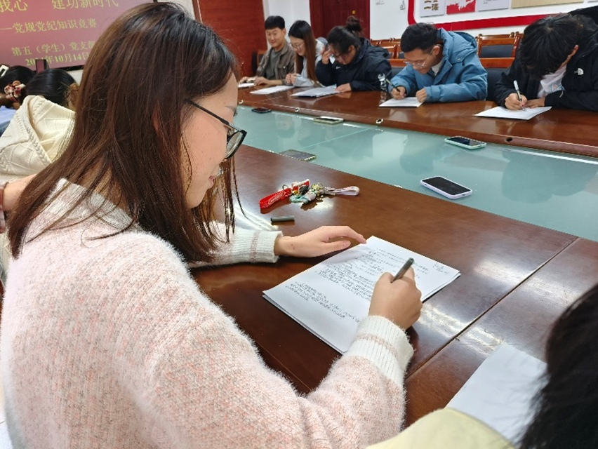 本次活动旨在提升党支部成员的纪律素养,深化对党规党纪的理解和把握,推动党规党纪主题教育建设纵深发展,比赛设置了选择题、填空题、问答题,既有对党规党纪基础知识的考察,又有对实际问题的应用。活动现场气氛热烈,党支部成员们屏气凝神,奋笔疾书,展现了第五(学生)党支部成员们的良好风貌和扎实基础。