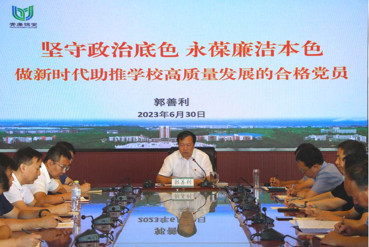郭善利以《坚守政治底色 永葆廉洁本色 做新时代助推学校高质量发展的合格党员》为题,从思想境界、道德修养和实际行动三个方面提出了要求。一是在思想境界上要强化党的意识、群众意识、责任意识和自律意识,进一步坚定理想信念,树牢宗旨观念,时刻保持共产员的先进性和纯洁性。二是在道德修养上做到慎初、慎独、慎友、慎言和慎好,提升道德修养,确保在各种腐蚀诱惑面前立于不败之地。三是在实际行动上把好家庭关、岗位关和监督关,不断提升政治修养,养成廉洁习惯,自觉接受监督,筑牢拒腐防线。党课最后,郭善利勉励全体党员干部教师,要坚定政治立场,抵御各种诱惑,站稳人民立场,为学校事业高质量发展积极贡献力量。