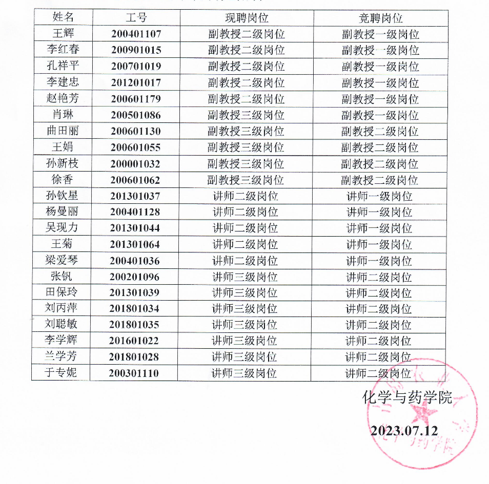 根据学校《关于开展下一聘期岗位设置与聘用工作的通知》要求,经个人申报、学院材料审核,现将竞聘副教授一级岗位、副教授二级岗位、讲师一级岗位和讲师二级岗位的教师申报材料进行公示,公示时间为2023年7月12日至14日。对竞聘材料有异议的,请在公示期内拨打电话(0532-58957891)反馈。