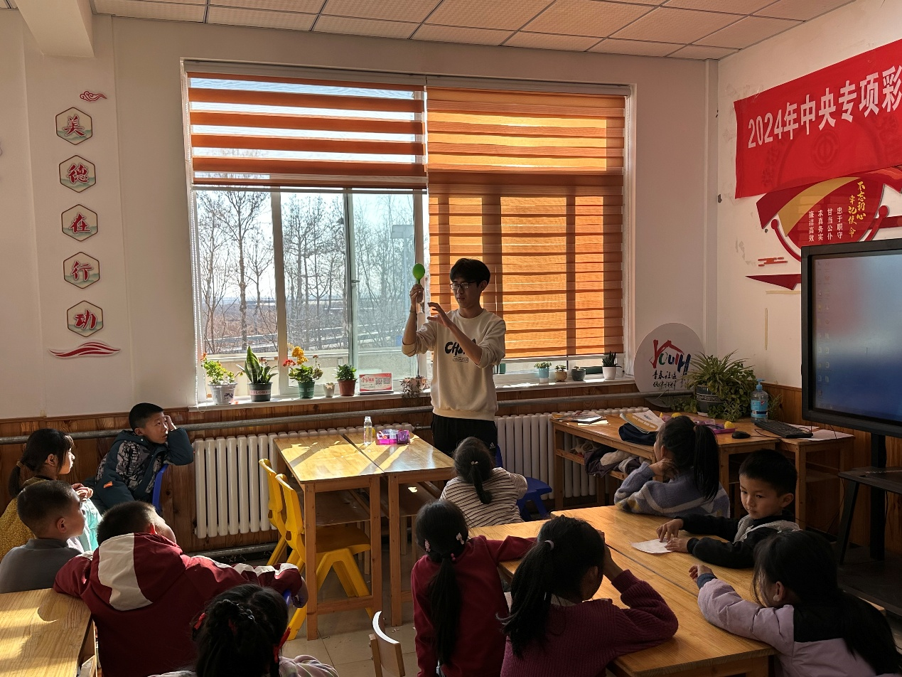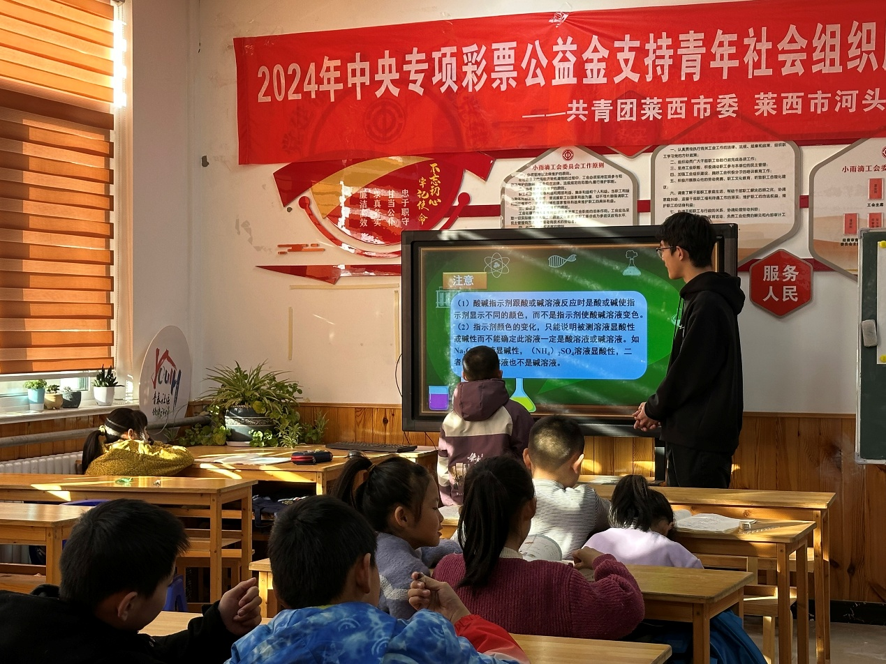 支教活动的科学课堂上,志愿者巧妙地利用生活实例,简单明了地讲解酸碱指示剂的原理,让他们直观理解酸碱反应,激发对科学的好奇心和热爱。
