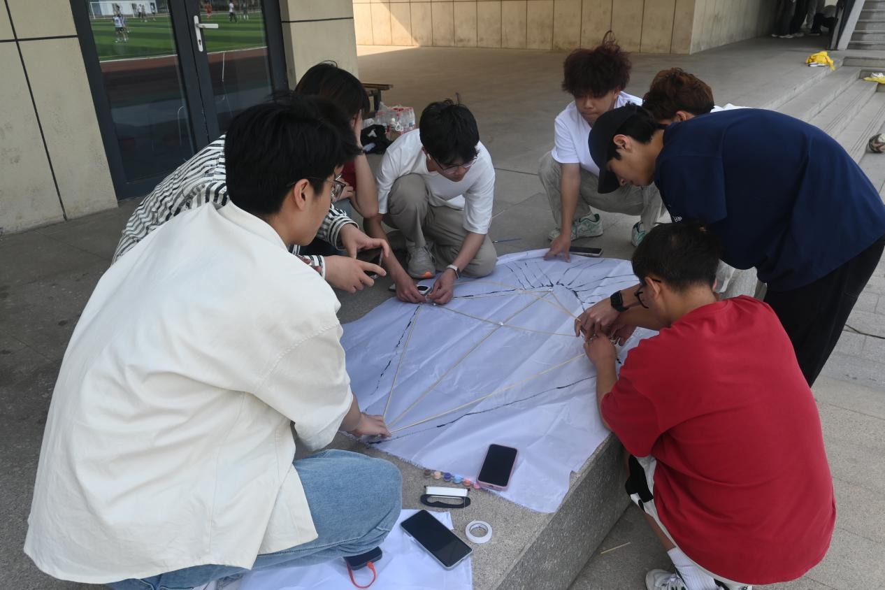 活动开始,青马建设中心学生干部唐力俊向同学们简要介绍了风筝的起源及制作流程,随后为大家分发素绢、颜料、画笔、竹条、细绳等制作材料。现场学员自由组队,分为五个小组,有条不紊地开始搭建骨架、绘制图案、贴布绑线,大家分工明确、相互配合,充分发挥各自的创意与特长,经过长时间的精心制作,多只色彩斑斓、形态各异的风筝成功起飞。在“扎、糊、绘、放”风筝的过程中,同学们不仅增强了动手能力,还深切领略到中华优秀传统文化的独特魅力。活动最后,全体学员合影留念,定格这一充满活力与欢乐的瞬间。