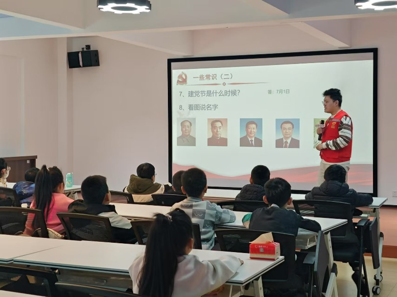 活动以以小朋友们熟知的热门动漫为切入点,选取有趣剧情,深入剖析其中的化学原理。 为让孩子们理解化学反应本质,队员们结合剧情设计“蝶豆花茶变色实验”,亲自示范操作,引导孩子们观察颜色变化,激发他们对化学知识的兴趣。实验课后,实践队员郑稳超开展“党史专题教育”。他以提问开场,通过问答、播放视频和展示照片等形式,进行党史常识问答。课堂尾声,全体师生合唱《歌唱祖国》,爱国之情在心中升腾。下午,实践队员配合东方社区课程,为孩子们带来数学益智游戏。他们设计多个融入数学知识的小游戏,孩子们踊跃举手,专注计算,在欢乐中学习数学知识。