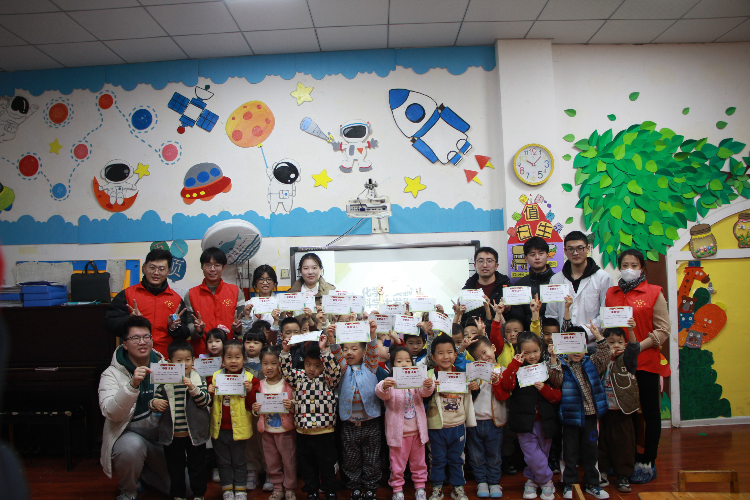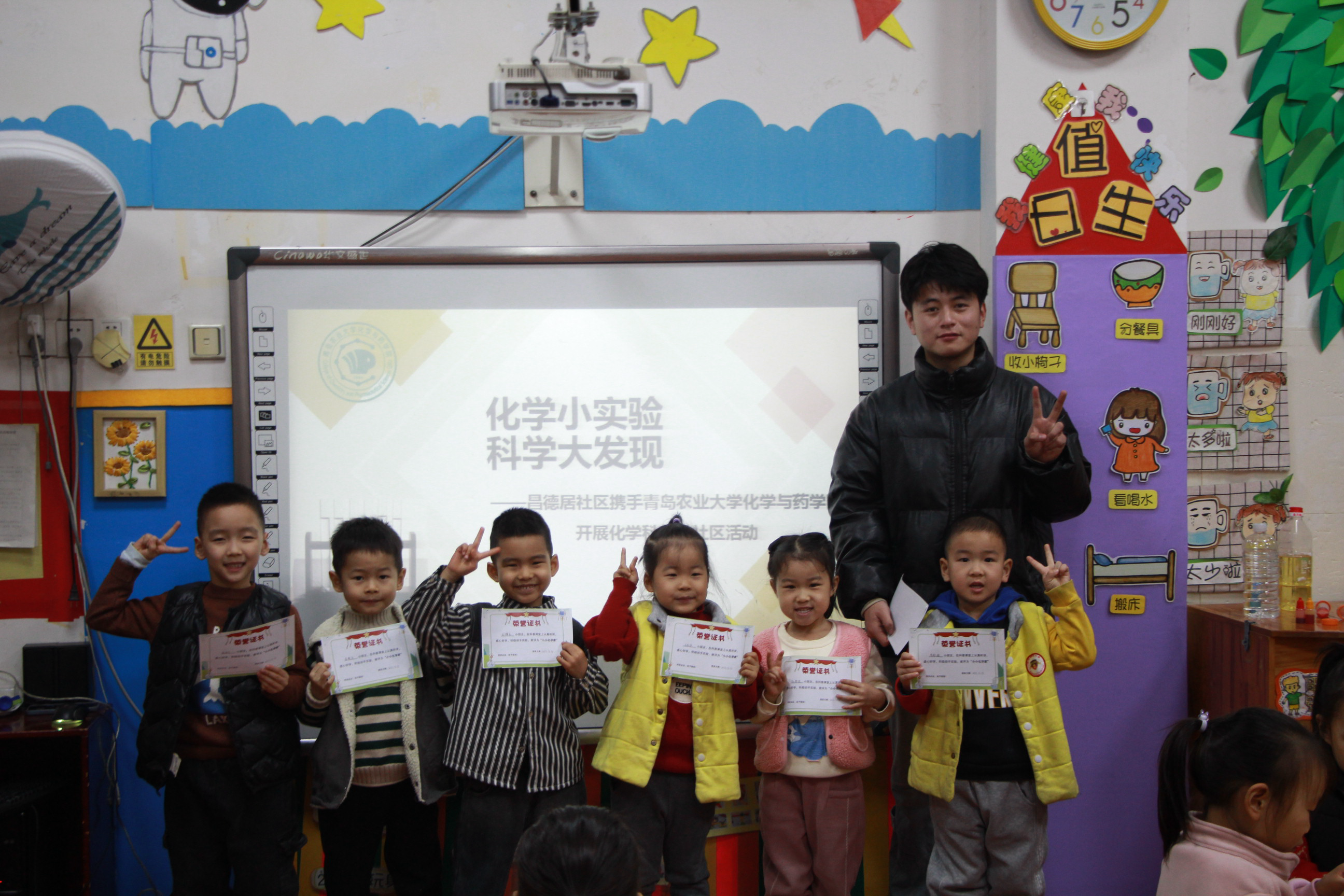 志愿者董瑞健表扬了小朋友们在课堂上踊跃发言以及正确的实验操作表现,并为他们颁发了“小小化学家”奖状。最后,全体师生、社区志愿者与孩子们合影留念。