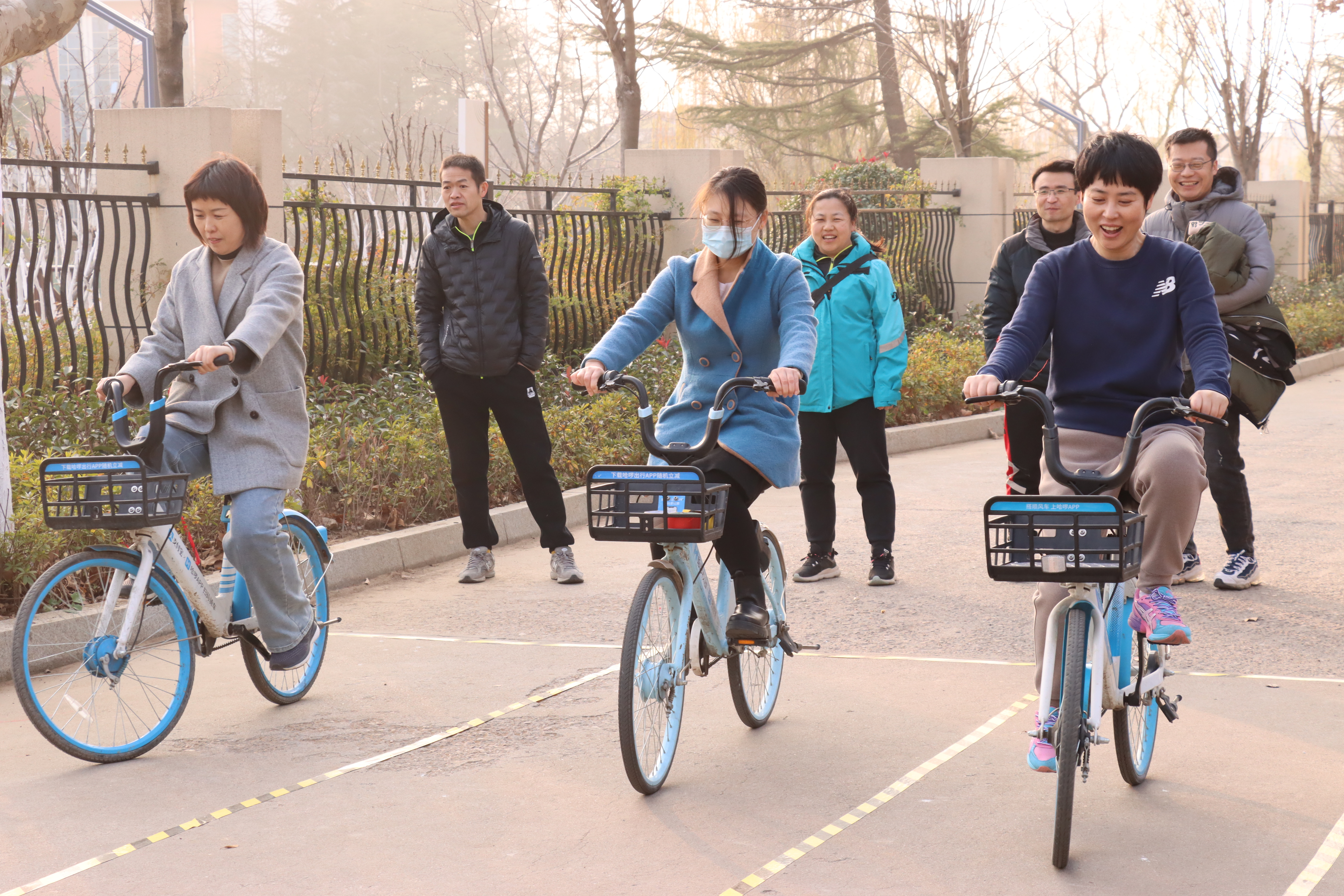 慢骑自行车比赛中,老师们纵身一跃跨上自行车,却又小心翼翼的缓慢骑动自行车,努力保证自行车的平衡,时不时有老师不小心脚落地,却也欢笑一片。