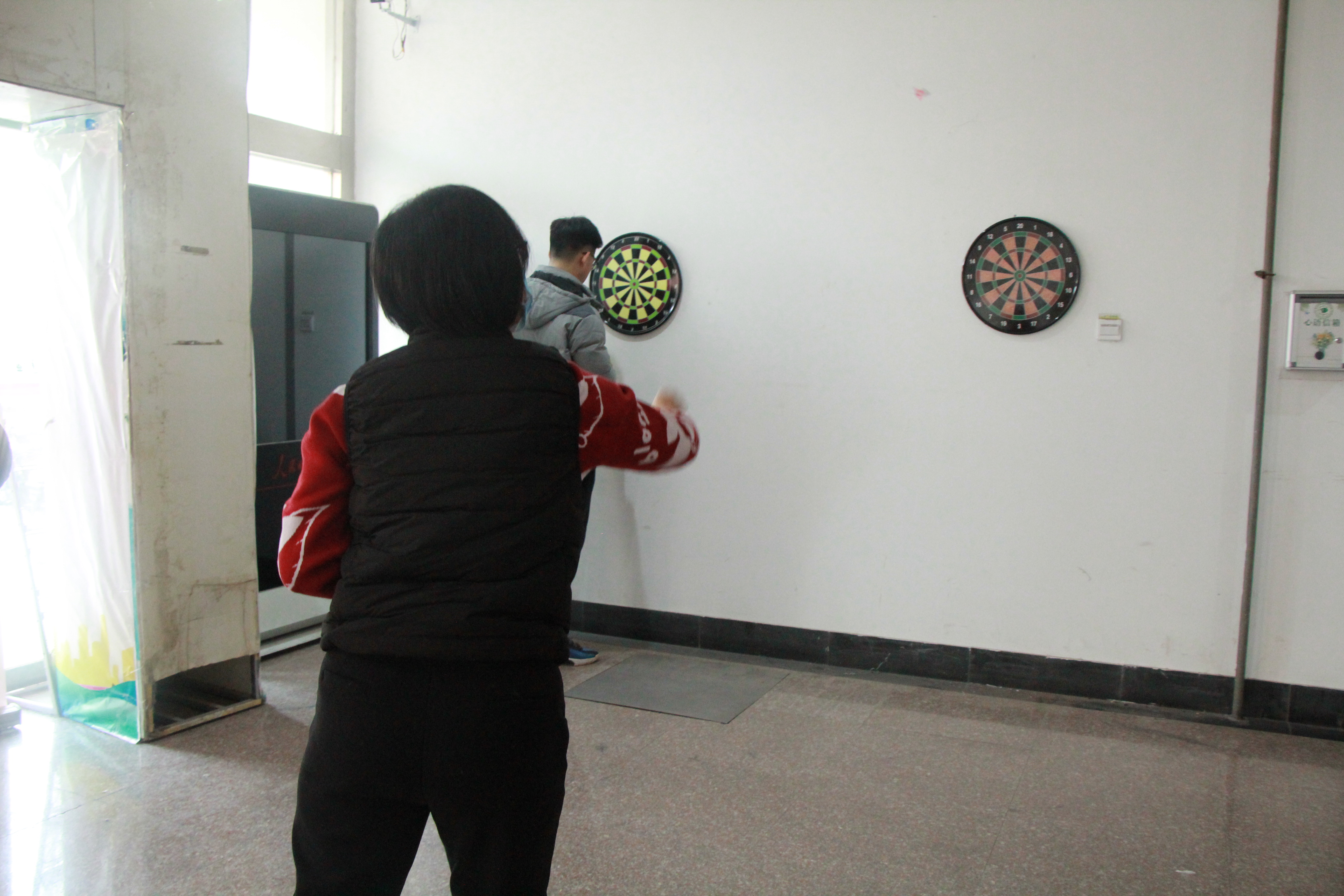 飞镖项目中,老师们摩拳擦掌,跃跃欲试,相竞上前展示自己掷飞镖的技能,飞镖落在镖盘上的声音清脆悦耳,欢笑声不断。