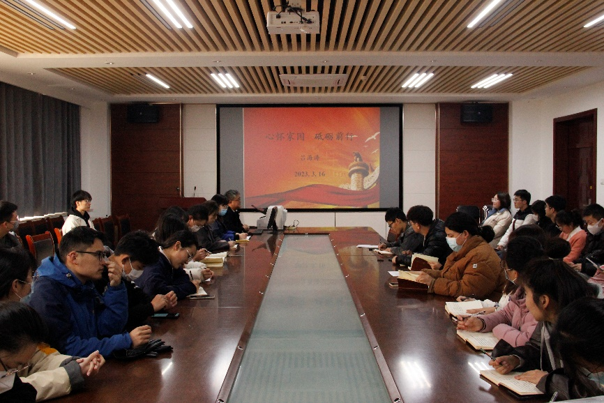 3月16日,专职组织员吕海涛以“心怀家国 砥砺前行”为主题为第四(学生)党支部讲授“开学第一课”。吕海涛表示,全体学生党员应怀“家国兴亡、匹夫有责”的责任感,要通过增强自身体魄、做好本职工作、学会明辨是非、知晓正视历史来培养家国情怀。