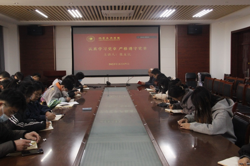 3月17日,党委副书记张友民以“认真学习党章,严格遵守党章”为主题为第五(学生)党支部成员讲授“开学第一课”。张友民强调,全体学生党员在今后在学习工作中要以党章为规矩,以党章为镜鉴,以坚强党性作为立身、立业、立言、立德的基石,始终保持好党员的先进性与积极性,发挥党员的先锋模范作用。