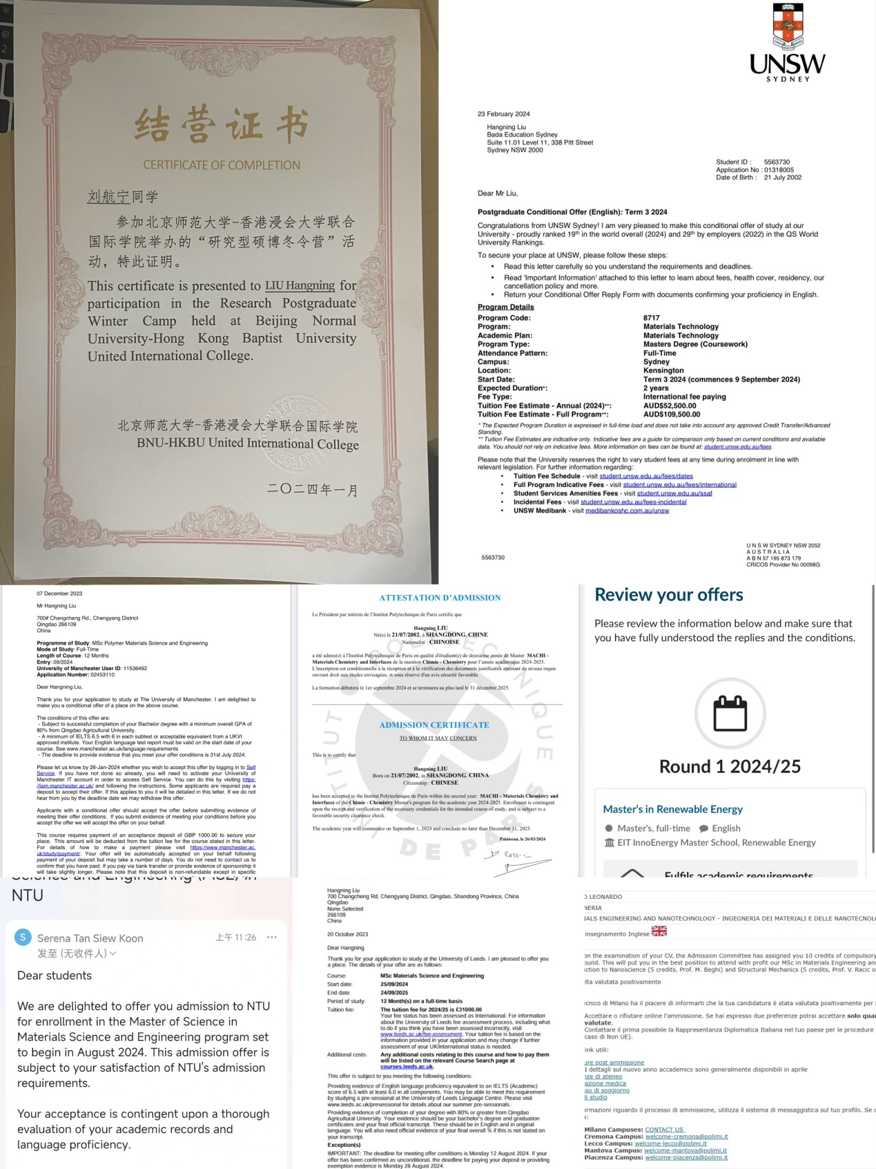 学院2024届毕业生刘航宁拿到新南威尔士大学、曼彻斯特大学、巴黎理工学院、南洋理工大学、米兰理工大学、利兹大学、欧洲创新与技术研究院等8所世界Top200学校的硕士offer。