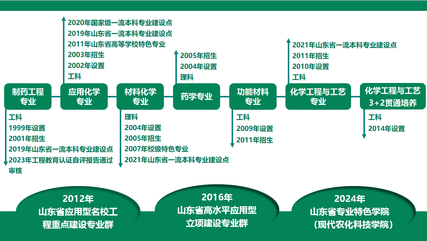 依托学校农科优势,发挥化学类学科专业与相关学科融合潜力,推动化学、材料等学科与农学、生命科学以及农业工程等学科交叉融合,强化专业内涵建设,突显专业群“农化特色”。先后获得山东省应用型人才培养特色名校重点建设专业群和山东省高水平应用型立项重点建设专业群建设项目支持, 2024年学院获评山东省首批专业特色学院。