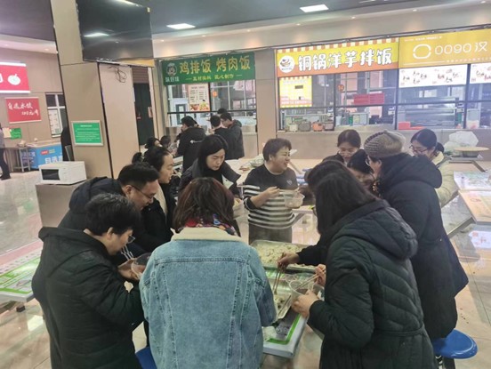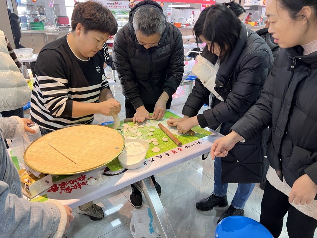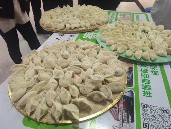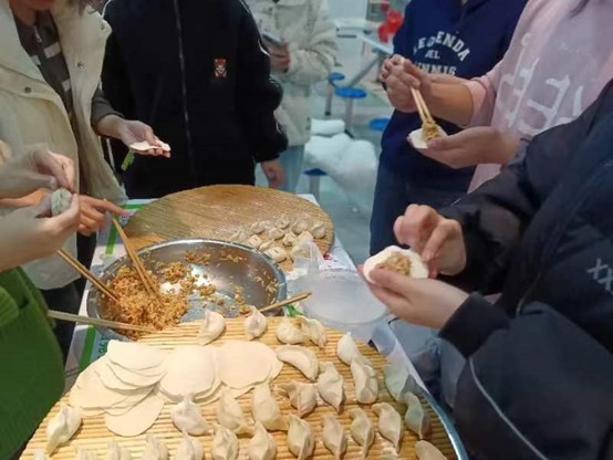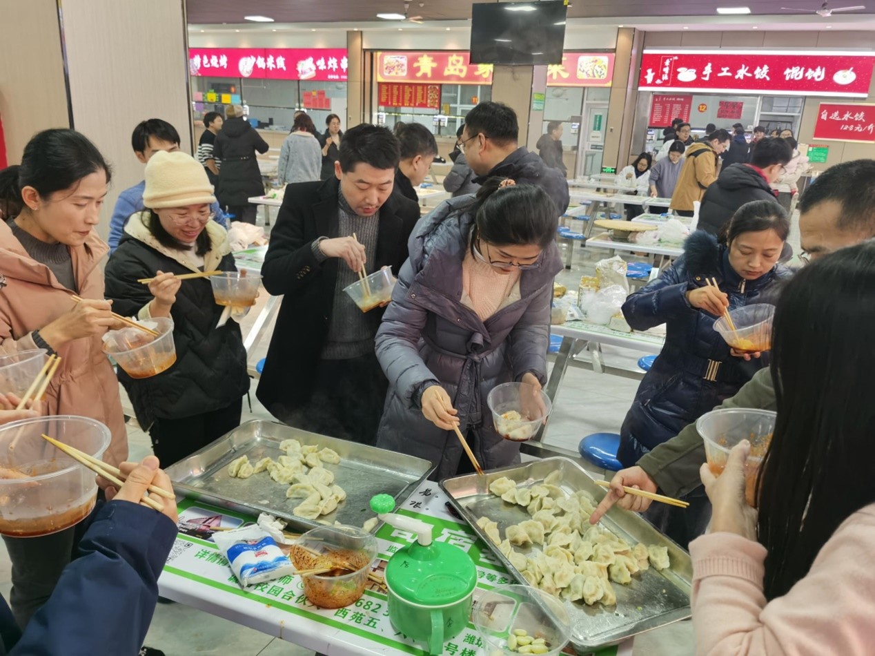在准备阶段,教职工拿着自备的工具,大大小小的碗盆、刀具、盖垫、擀面杖等工具让食堂立刻有了家的感觉。活动上,教师们分为几个小组,择菜、和面、擀皮、调馅分工合作,有条不紊,活动现场欢声笑语,热闹非凡,大家参与其中,场面其乐融融。在食堂师傅的帮助下,大家包好的饺子热气腾腾的出锅上桌,香味飘满了整个餐厅,教师们脸上都洋溢着快乐的笑容。