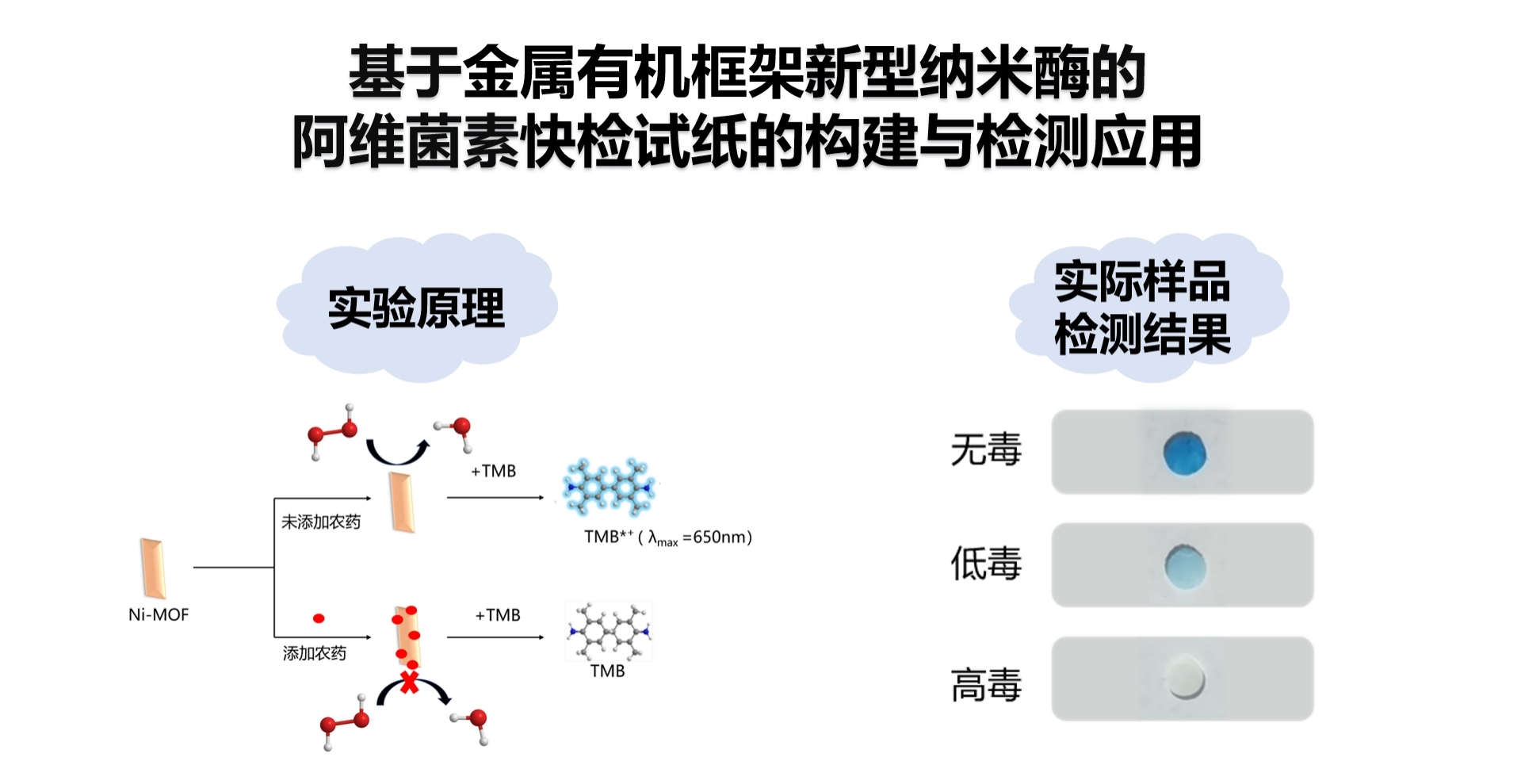 作品《基于金属有机框架新型纳米酶的阿维菌素快检试纸的构建与检测应用》由韩磊老师指导,马灵芝、吴力玲、冯龙祥三位同学完成。该作品通过物理沉积的方法构建了一种基于Ni-MOF活性抑制的阿维菌素快检试纸。该试纸可用于现场便携可视化快速检测,检测结果可以通过裸眼进行定性观察,手机进行定量检测。本实验以纳米酶及农药快检的应用瓶颈入手,引入纳米酶制备,活性检测,试纸制备,农药检测等操作,让同学们了解更多纳米酶和仿生催化的知识。本实验与日常饮食安全密切相关,使同学们意识到化学就在我们身边,激发同学们对科学的热爱。
