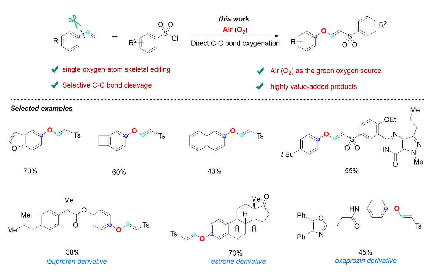 在化学领域,分子骨架编辑技术近年来崭露头角。与传统的从头合成方法相比,对分子结构的直接修饰节省了构建复杂分子库所需的资源和时间,为活性分子的发现提供了强有力的工具。然而,在复杂反应体系中对惰性碳碳键进行选择性修饰仍是一项极具挑战的任务。鉴于氧原子在生物活性分子中的普遍存在,通过氧原子插入实现碳碳键的直接氧化具有特殊的意义,对生物活性化合物的后期修饰和药物发现也至关重要。