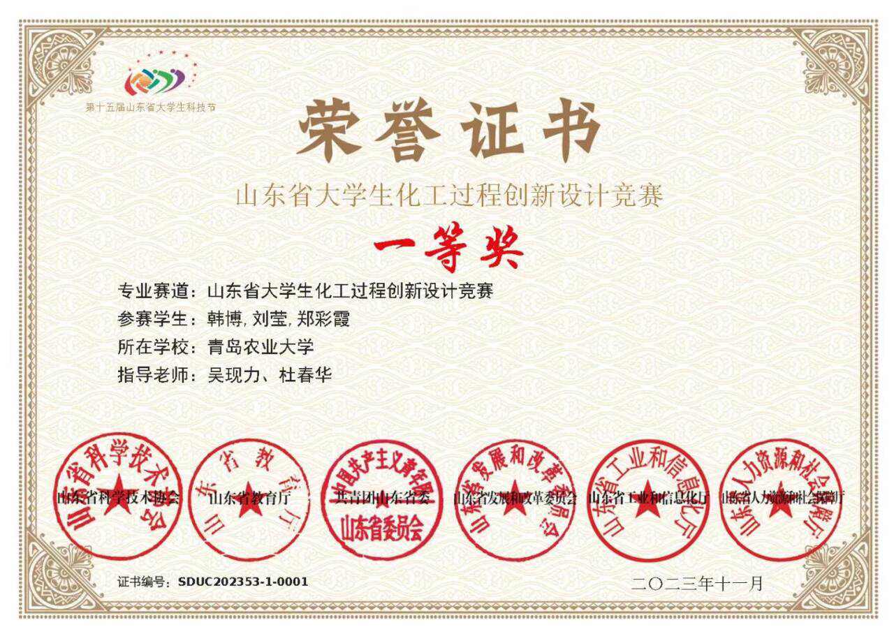 青岛农业大学45分钟过瘾拔萝卜视频在2023年“齐翔腾达”杯第十二届山东省大学生化工过程创新设计竞赛中取得优异成绩,本次竞赛学院共有八支队伍成功参赛,斩获省级一等奖一项,省级二等奖四项,省级三等奖三项。本次山东省大学生化工设计大赛为化学工程与工艺专业针对性竞赛。经过同学们的努力和老师的指导,最终取得此次令人满意的成绩。队伍指导老师为学院教师吴现力、许洁、王菊、杜春华、张欣欣、白玉兰、梁晨、陈怀春、李双双。