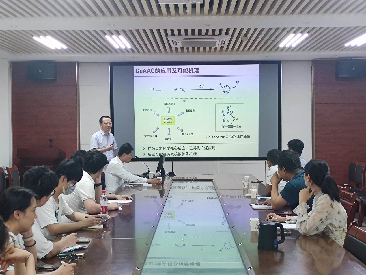 周剑教授报告以《铜催化的叠氮和炔烃的不对称环加成反应》为题介绍研究工作。周剑教授团队研究工作重点在于立足协同催化的理念,结合新催化剂和新试剂的设计开发,发展导向具有手性季碳的药物优势骨架的不对称催化构建新方法。