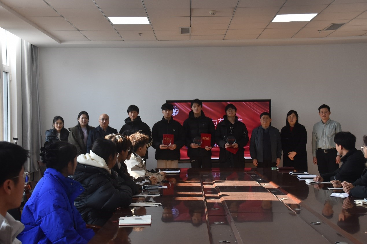 王进国为四名同学颁发了“见义勇为”证书和奖杯,对他们的见义勇为行为给予了高度肯定。他表示,这四名同学在人民群众生命面临危险的紧要关头,临危不惧、挺身而出,用行动展现出了优秀的品质人格以及作为化药学子、青农学子的担当精神。王进国呼吁广大师生应以王俊博、李自远、张俊哲、游越这四名同学为榜样,积极帮助他人、服务社会,弘扬见义勇为精神。同时,也希望全体同学能够内化于心、外化于行,在今后的学习生活中不断践行社会主义核心价值观,做真善美化药人。