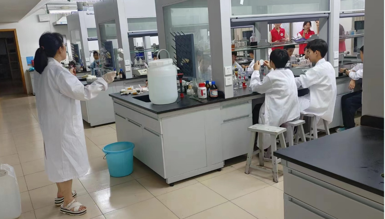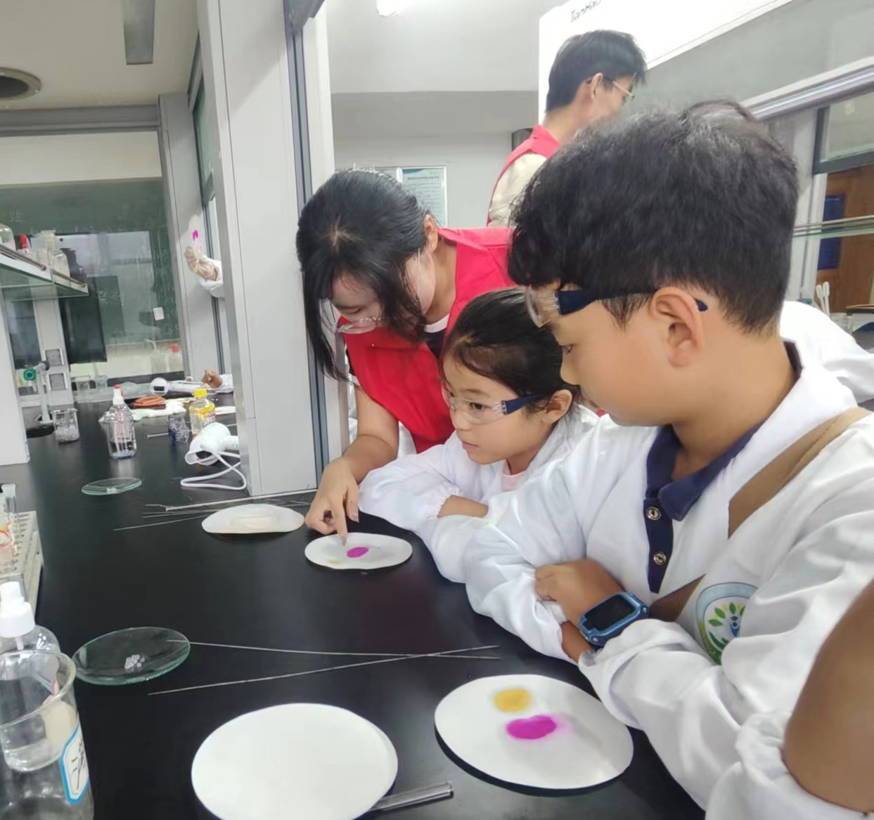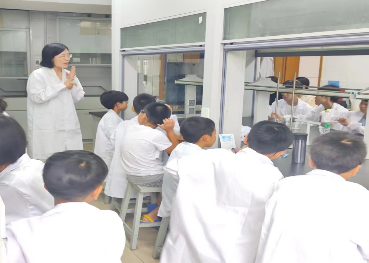 然后在志愿者的引领下,在化学楼331进行变色实验,先由梁爱琴老师进行实验的演示讲解,然后孩子们分组进行实践操作,在旁的志愿者对孩子们进行了操作和思考的引导。此环节不仅培养了孩子们的实践、观察的能力还能帮助孩子们更深入、更扎实地理解化学概念和原理。