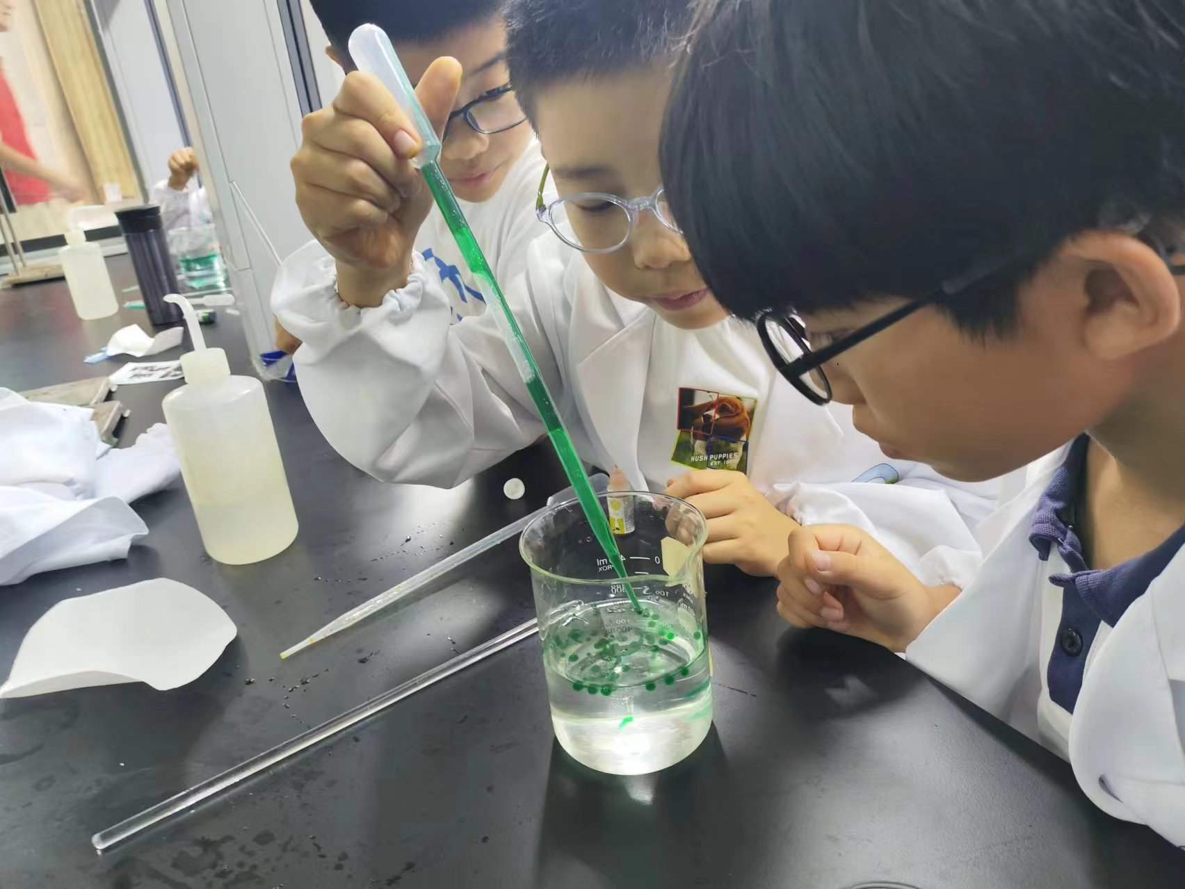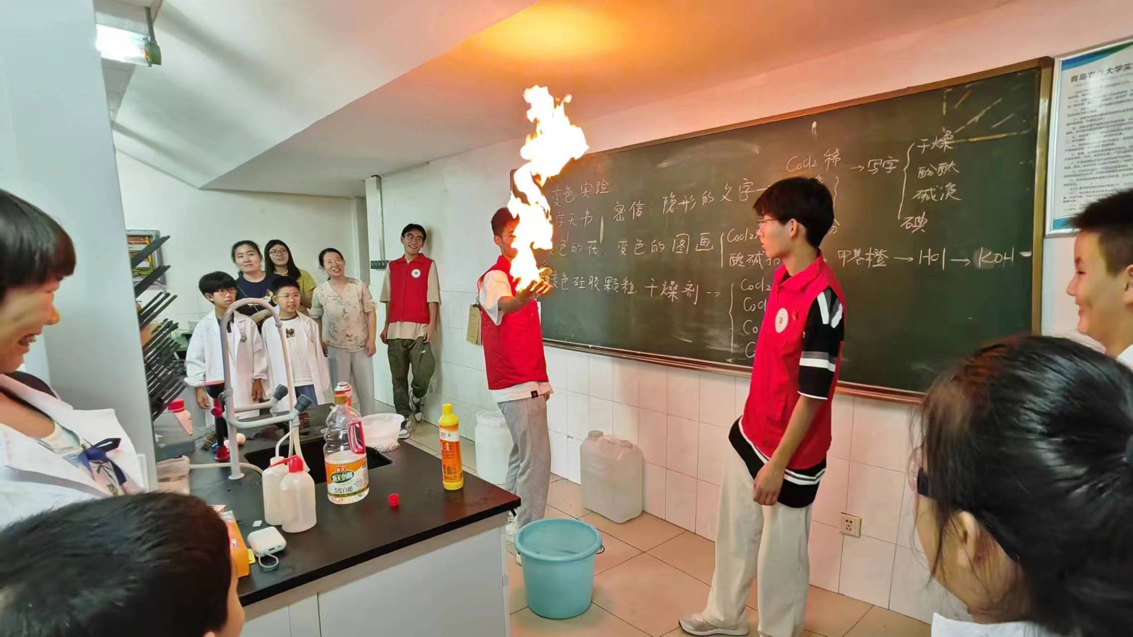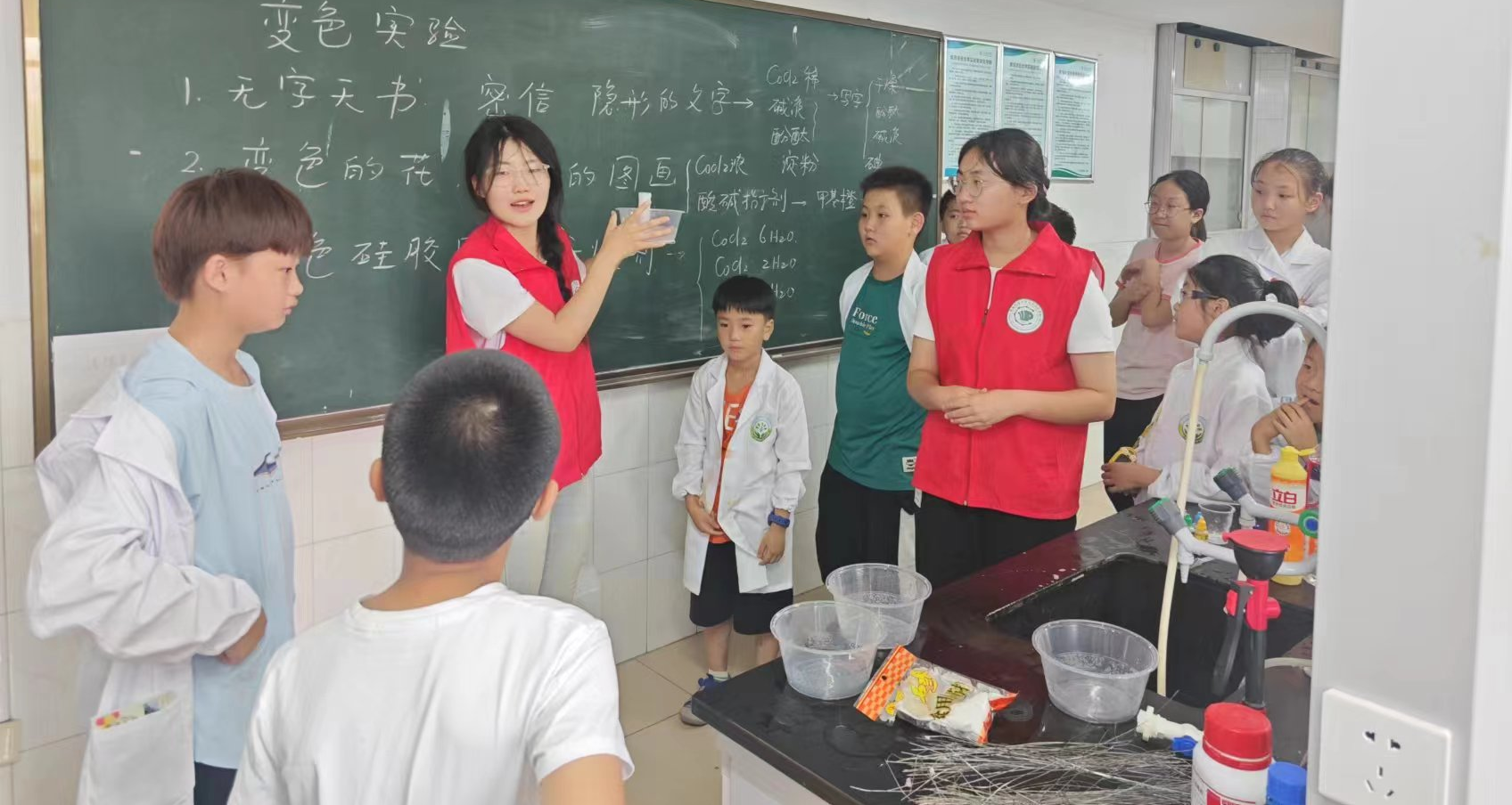 然后在志愿者的引领下,在化学楼331进行变色实验,先由梁爱琴老师进行实验的演示讲解,然后孩子们分组进行实践操作,在旁的志愿者对孩子们进行了操作和思考的引导。此环节不仅培养了孩子们的实践、观察的能力还能帮助孩子们更深入、更扎实地理解化学概念和原理。