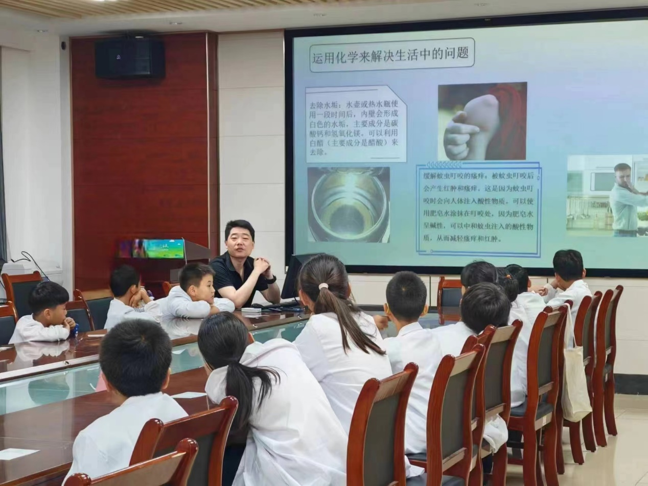之后,王杰老师和李帅帅老师在化学楼207讲解了化学的发展史以及化学在衣食住行等日常生活中的应用,增强了孩子们在生活中对化学的感知力。