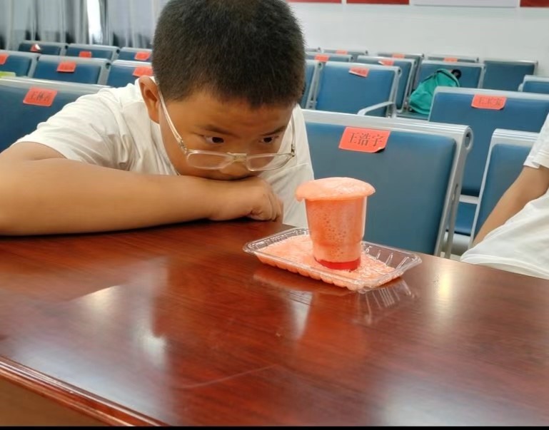 实践团成员武柄辰与刘德凯,带领小朋友们制作了“香草奶昔”,冒出的泡沫吸引了小朋友们,他们睁着大大的眼睛观察着实验现象,每个人都在认真地学习。小朋友们亲自动手进行实验,从中收获了数不清的知识与欢乐。
