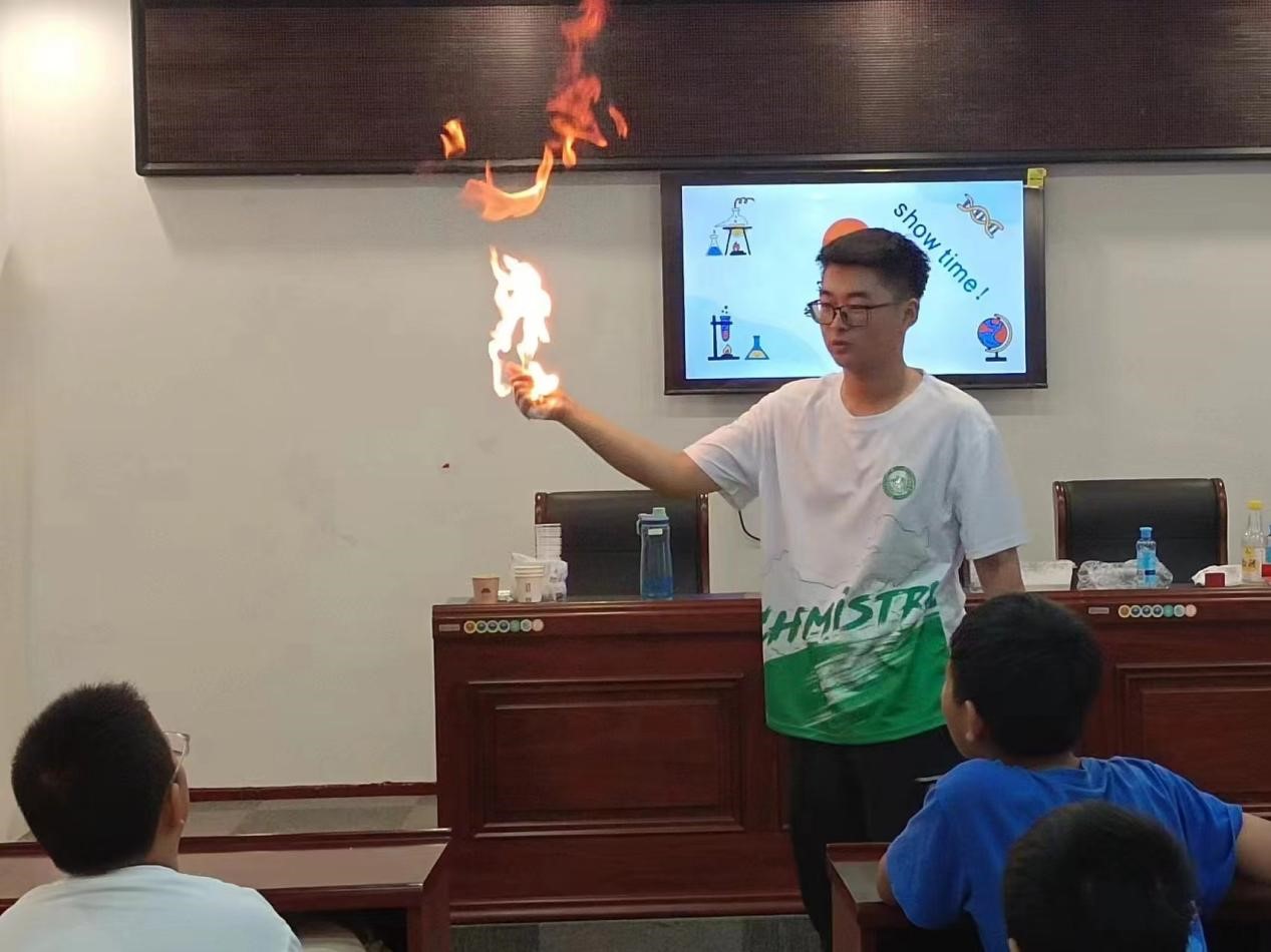 实践团成员苏诚利用丁烷完成了“掌中起火”这一实验,小朋友们纷纷提出了自己的疑问:“为什么产生了火焰?”“燃烧的火焰会烧到手吗?”“怎样做出这个实验的?”苏城,用亲切的语言一一进行解答,小朋友们也明白了其中的奥秘,纷纷表示要学好化学、学好知识。
