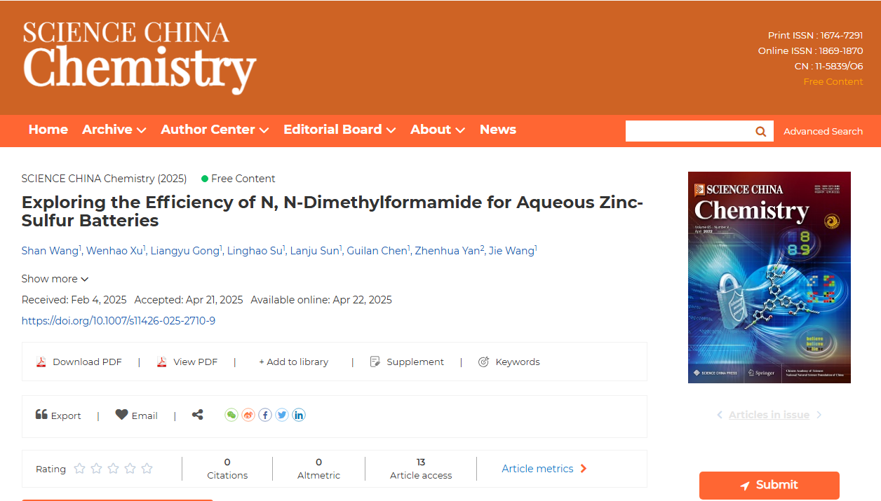 近日,青岛农业大学45分钟过瘾拔萝卜视频王杰教授在中国科学院一区TOP期刊《Science China Chemistry》(影响因子10.4)上发表题为“Exploring the Efficiency of N, N-Dimethylformamide for Aqueous Zinc-Sulfur Batteries”的研究论文,通过引入DMF起到了增强阴极处固/液相互作用、减少锌阳极界面处的极化以及固定I2催化剂防止升华等作用。