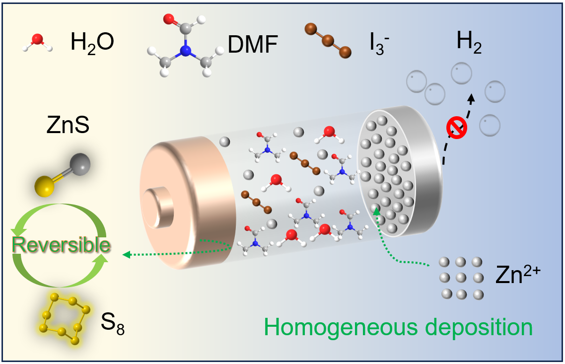 可充电水系锌硫电池(ZSBs)虽具备高电压平台和容量的储能优势,却受限于缓慢反应动力学与低可逆性。本研究提出由空气稳定型N,N-二甲基甲酰胺(DMF)/水双溶剂、三氟甲磺酸锌(Zn(OTF)2)及微量碘(I2)构成的新型电解质体系,通过三重协同机制实现性能突破:1)强化硫阴极固-液界面动力学,2)降低锌阳极界面极化,3)固定I2催化剂抑制升华。DMF与I2的配位作用促进I3-活性中间体生成并稳定碘物种,同步提升催化效率与热稳定性。DMF的高脱溶剂化能力优化电极润湿行为,有效抑制阴阳两极副反应。基于该电解质的Zn-Zn对称电池展现出显著降低的极化电压(25 mV)、超1200小时循环寿命及致密无枝晶的锌沉积形貌,证实其优异的界面可逆性与动力学特性。