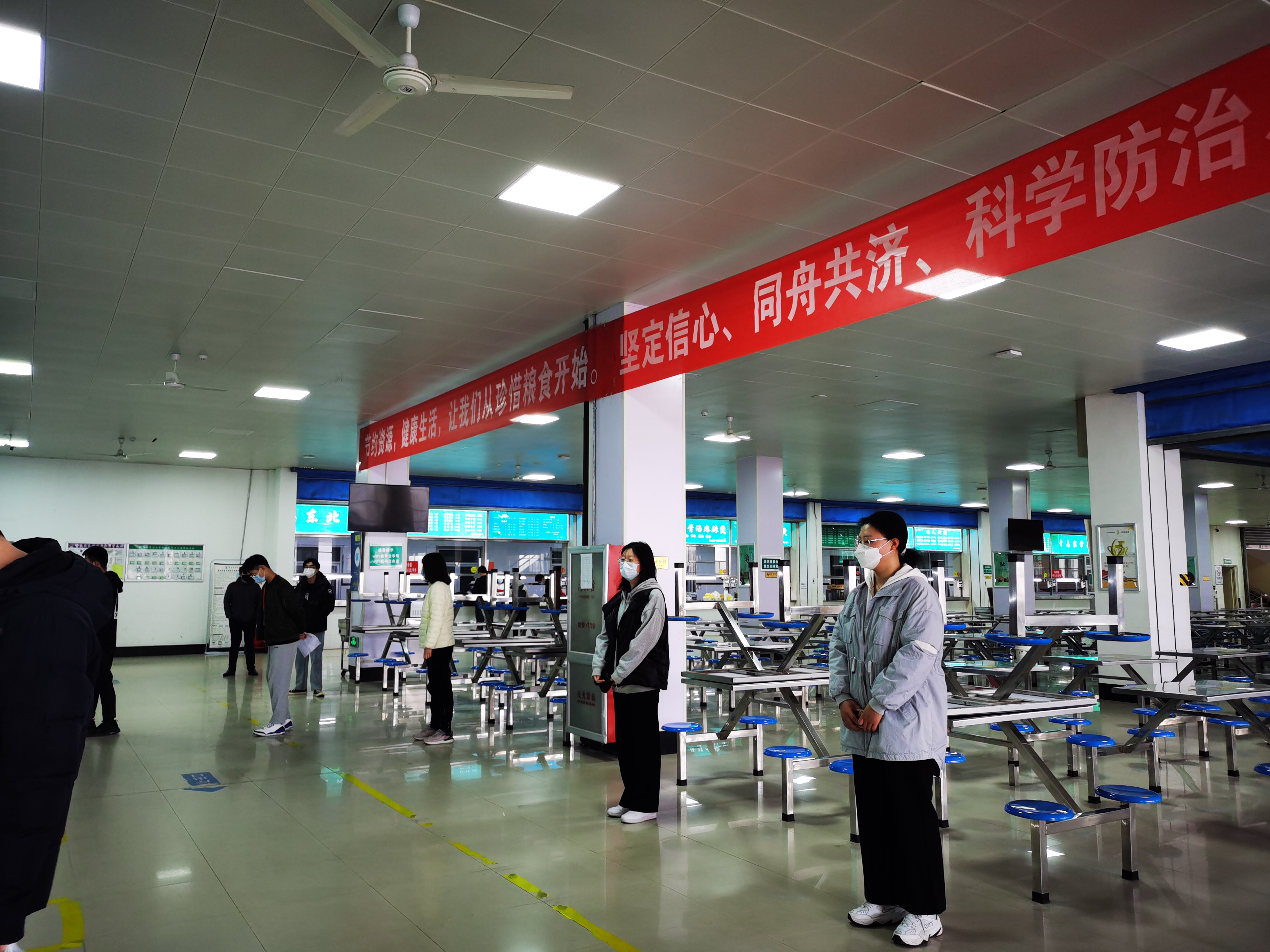 学生志愿者在餐厅提醒同学们保持一米以上安全间距