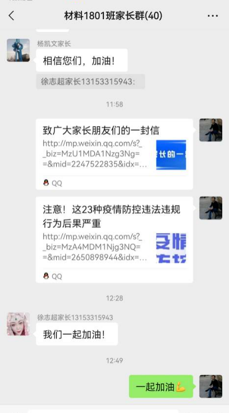 为把疫情防控措施贯彻落实到位,学院全体班主任做到第一时间与学生家长沟通,纾解家长对学生在校生活的担忧,家校协同,形成战疫合力,为封校期间的学生心理健康和学习生活保驾护航。此外,全体班主任老师坚守云端战“疫”防线,通过组织召开线上班会和个别谈心谈话,及时落实学校相关工作要求,全面掌握学生思想动态,引导学生缓解焦虑、认真学习、乐观生活、积极运动、规范作息,自觉遵守校园管控各项规定,以实际行动守护好我们的家。