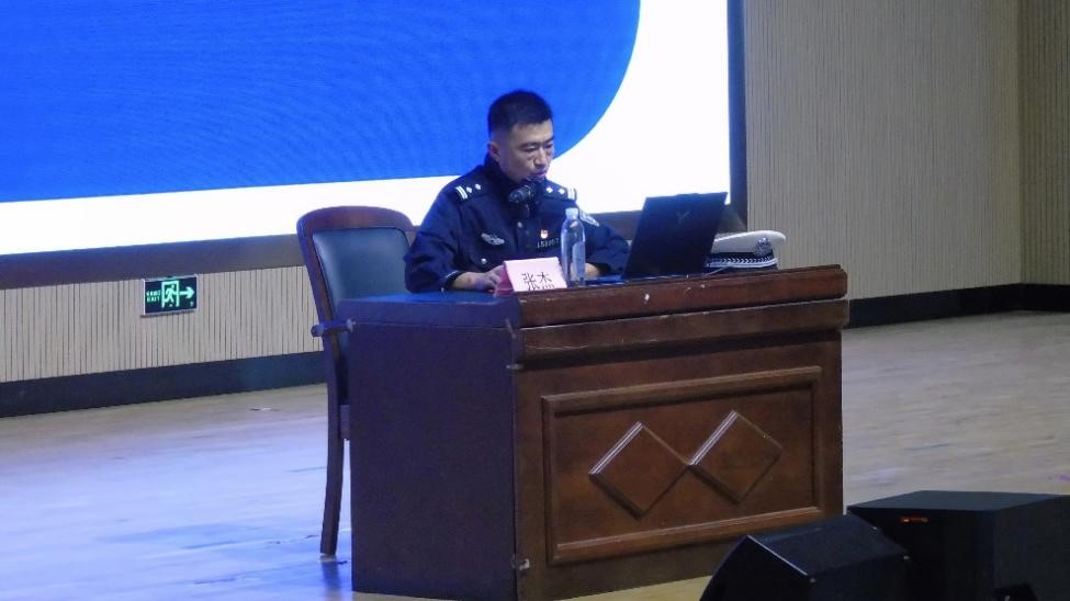 胡勋涛首先对张杰的到来表示诚挚的欢迎与感谢。张杰围绕“飙车酷、跨栏酷、骑行酷、乘车酷”四种典型安全问题展开讲解,提出要牢记“一盔一带”,拒绝“飙车炸街”,同时通过播放惨案事故的视频和列举各种违法事例引出《中华人民共和国道路交通安全法》,对涉及的法律法规进行深入解读。
