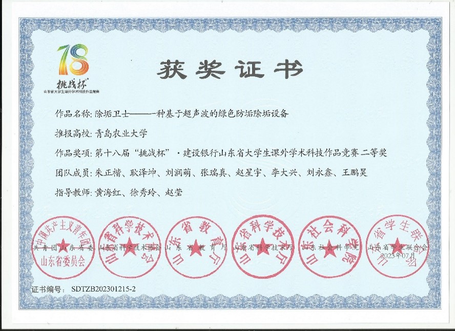 由共青团山东省委、山东省科学技术协会、山东省教育厅、山东省科学技术厅、山东省社会科学院、山东省学生联合会主办的第十八届“挑战杯”·建设银行山东省大学生课外学术科技作品竞赛决赛落下帷幕。青岛农业大学45分钟过瘾拔萝卜视频两支队伍荣获大赛二等奖,分别是由黄海红、徐秀玲、赵莹老师指导的《除垢卫士——一种基于超声波的绿色防垢除垢设备》和由王杰、董冬旗、龚良玉老师指导的《打败醛世界——基于Cu@Co3O4纳米催化剂的高效甲醛净化装置》。