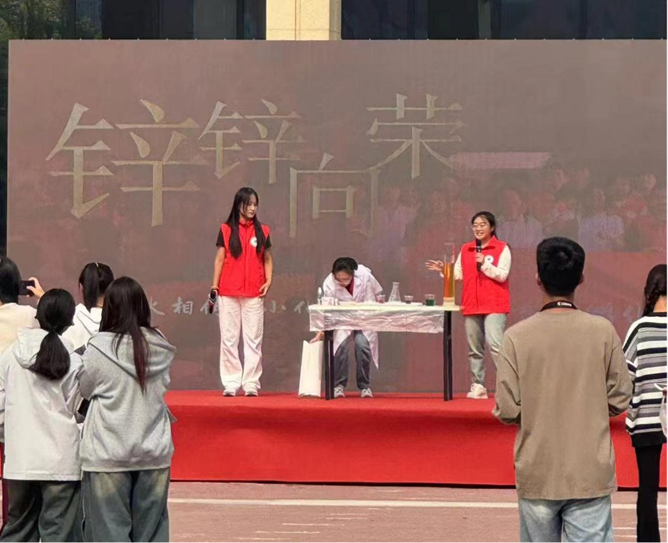 “锌”火相传小小化学家还积极参加社团管理中心所组织的舞台表演活动,通过一系列精彩纷呈的化学实验,为同学们带来直观的视觉效果,让同学们近距离感受化学魅力。舞台之上,社团成员身着整洁的实验服,手持精密的实验器材,以富有激情的态度,逐一呈现精彩纷呈的化学实验。从色彩斑斓的化学反应,到令人惊叹的物质变化,每一个实验都引人入胜,不断激发同学们的好奇心与探索欲。