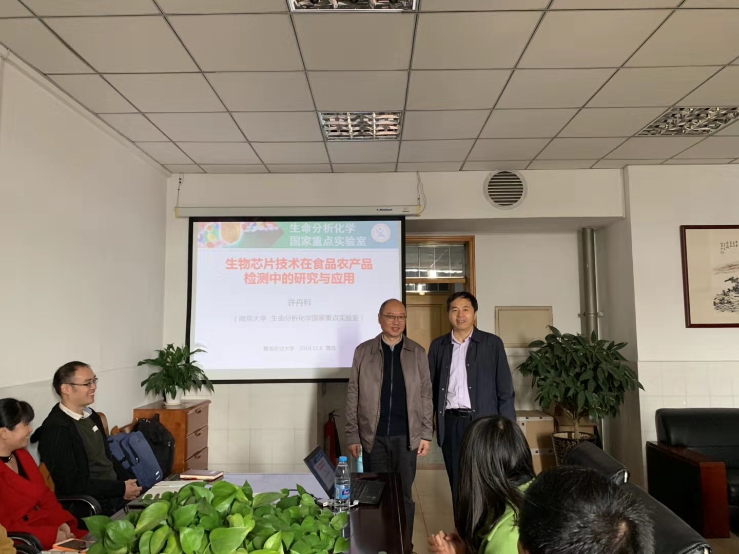 日,南京大学许丹科教授与南京祥中生物科技有限公司总经理王东到课题组指导工作。许丹科教授以“生物芯片技术在食品农产品检测中的研究与应用”为题,从生物芯片前沿技术与生物芯片的产业化研究方向出发,系统介绍了许教授所研制的可视化生物芯片在高通量、多靶标、智能化、可视化、成本等多方面的优势。报告会结束后,许教授对课题组目前开展的山东省重大基础研究项目“食品安全在线、原位快检系统的构建”提出了宝贵的意见与建议。