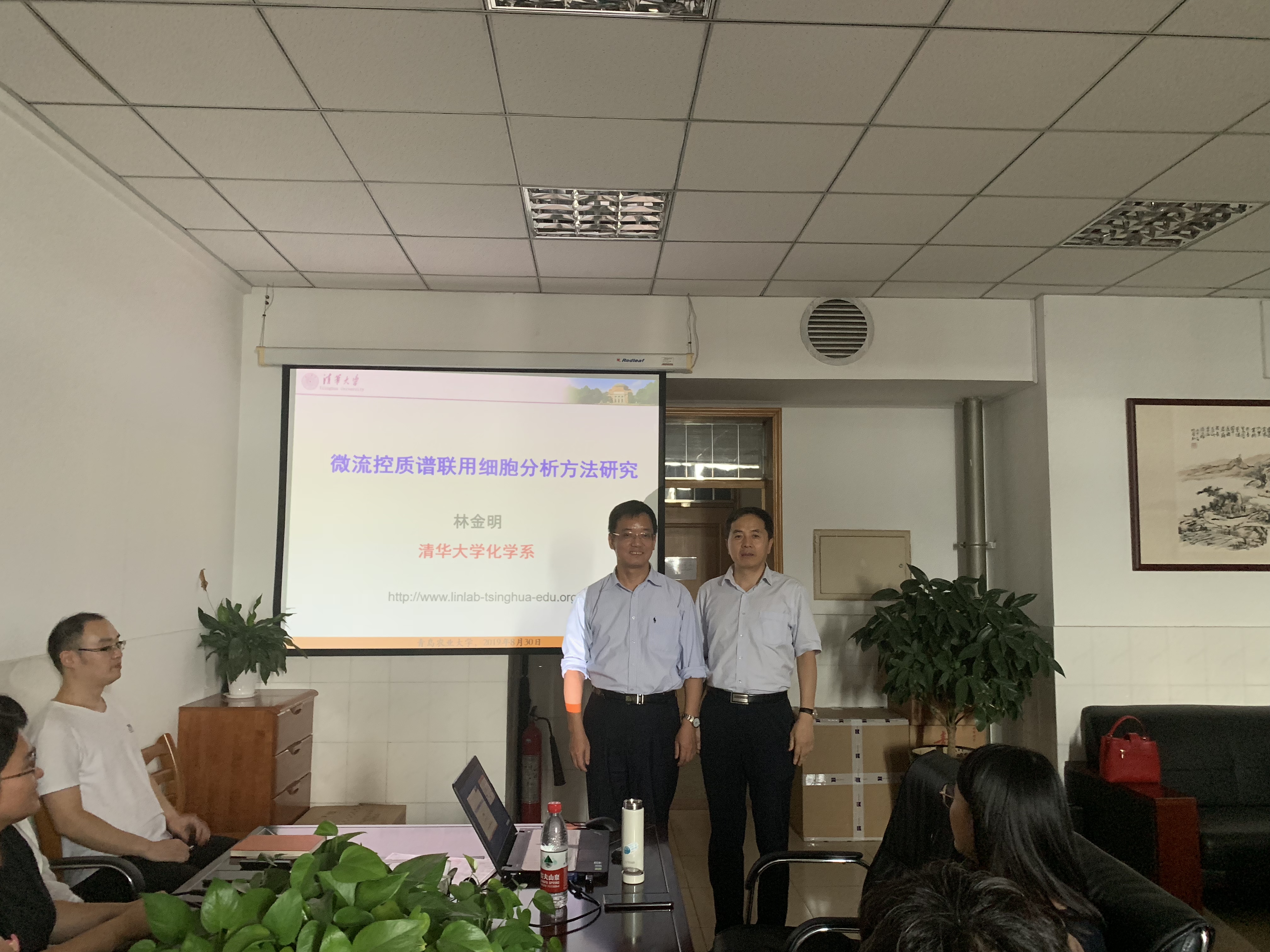 课题组邀请清华大学林金明教授到课题组指导工作并作精彩报告。林金明教授以《微流控质谱联用细胞分析方法研究》为题,系统介绍了细胞研究工作的重要性、细胞的共培养、芯片设计与质谱联用等系列研究工作。