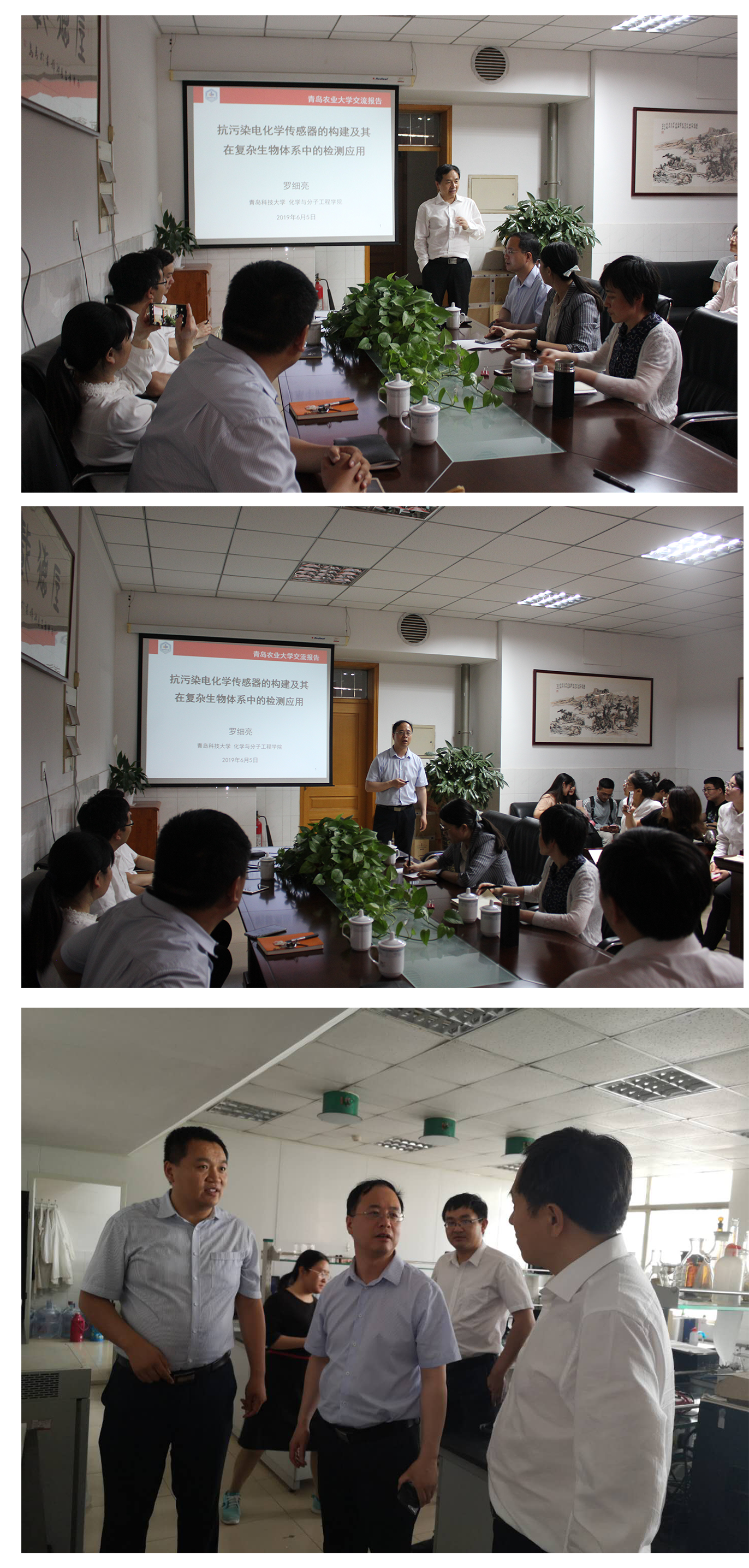2019年6月5日,课题组邀请青岛科技大学化学院院长罗细亮教授到课题组指导工作,并作精彩报告。罗细亮教授以《抗污染电化学传感器的构建及其在复杂生物体系中的检测应用》为题,详细阐述了复杂生物体系中抗污染生物传感器的研究背景与解决办法,系统介绍了他的团队基于PEG衍生物、两性离子聚合物、多肽等构建的抗污染生物传感器在复杂生物体系样本中的研究工作。