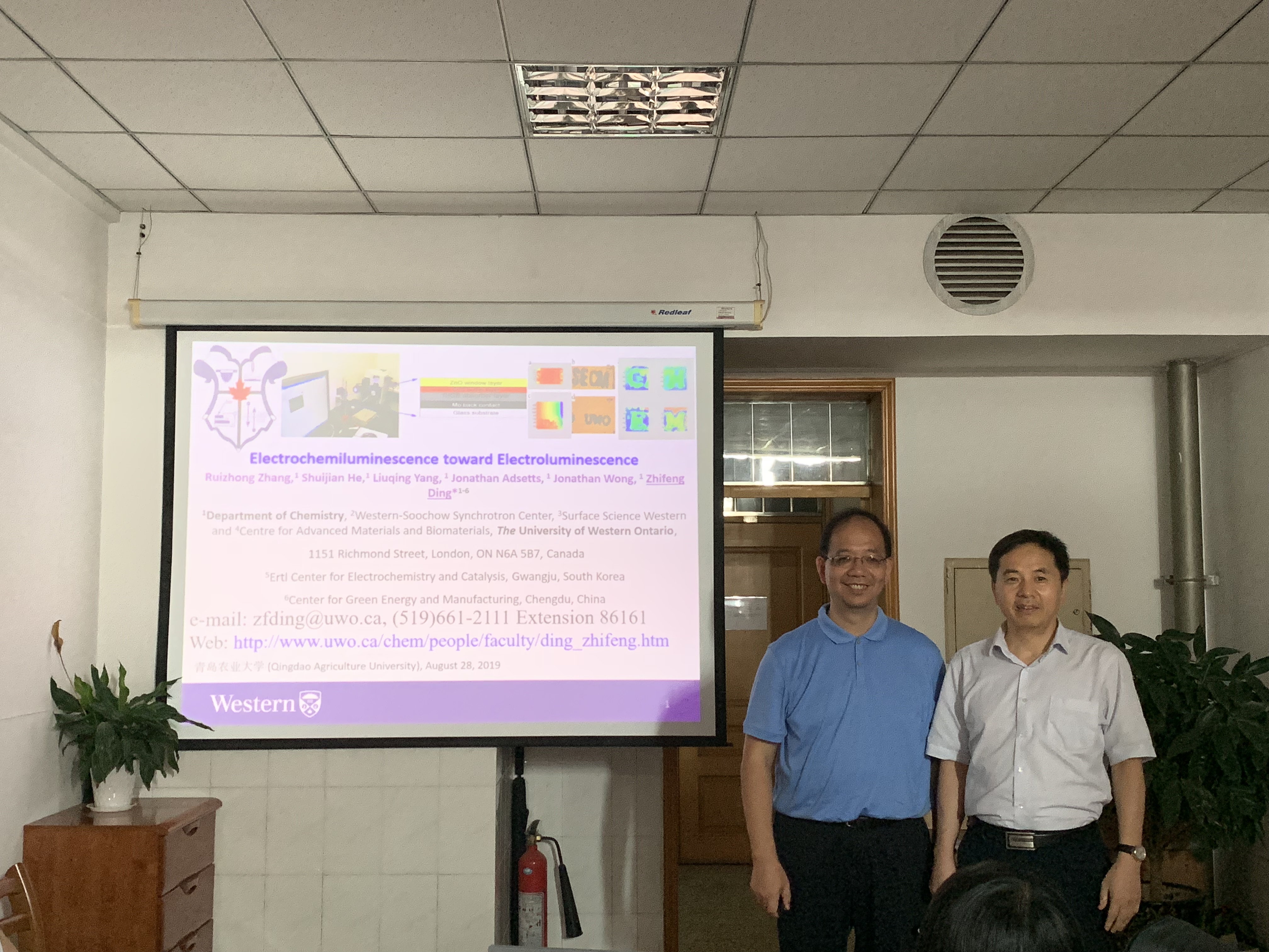 课题组邀请加拿大西安大略大学丁志峰教授到课题组指导工作并作精彩报告。丁志峰教授以《Elecrochemiluminescence toward Electroluminescence》为题,从电化学发光的原理出发,系统介绍了他的团队在电化学发光方面的系列研究工作。