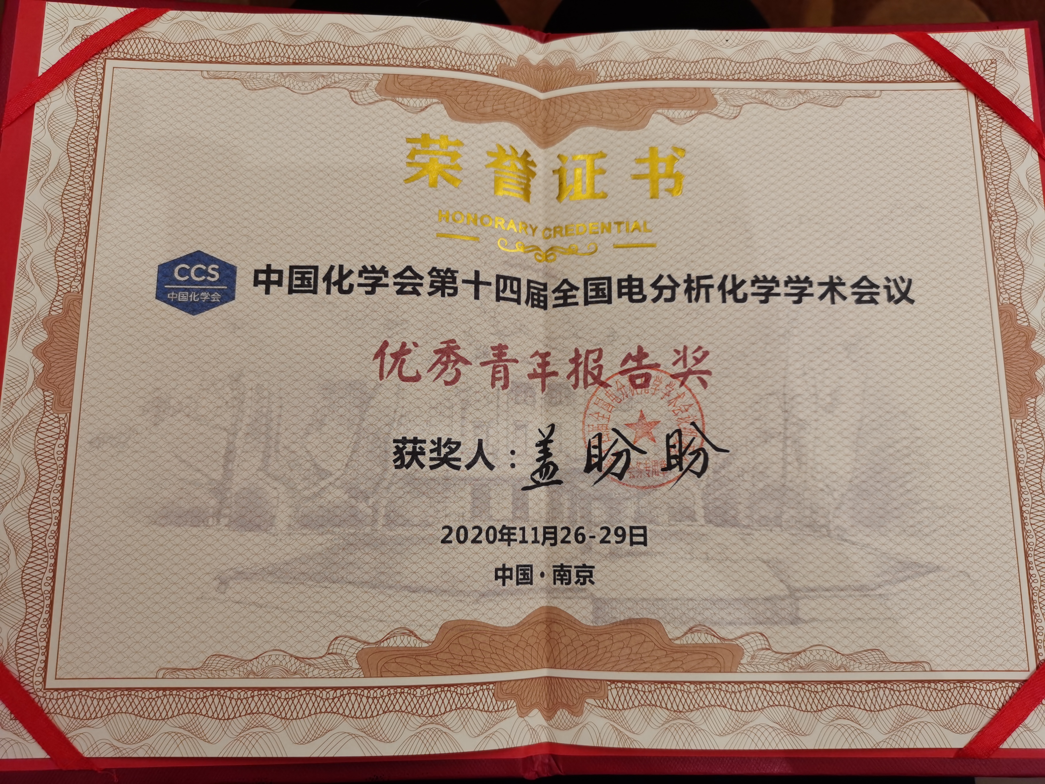 由中国化学会和中国仪器仪表学会主办,东南大学化学化工学院与南京大学生命分析化学国家重点实验室承办的第十四届全国电分析化学学术会议于2020年11月26日至2020年11月29日在江苏省南京市召开。课题组李峰教授、侯婷教授、盖盼盼教授、常加富博士和课题组14名研究生参加会议交流学习。李峰教授做邀请报告,盖盼盼教授做口头报告并获优秀青年报告奖。